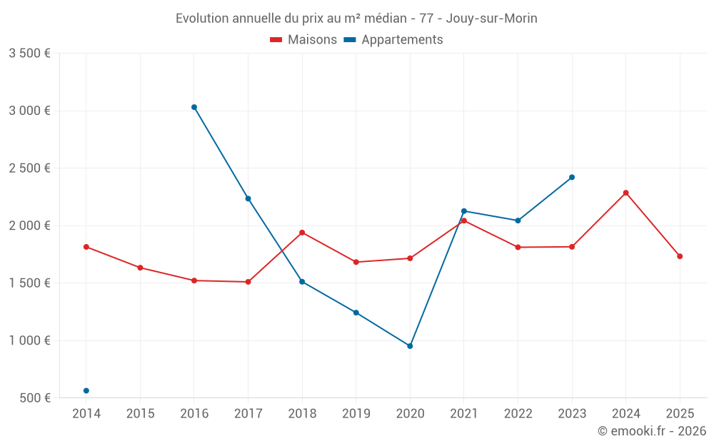 Le prix médian sur les 16 transactions de maisons des 12 derniers mois dans la commune de Jouy-sur-Morin était de 2 276 € par mètre carré pour une valeur foncière médiane de 178 500 €. Sur cette période 60% des transactions se sont situées entre 1 063 et 2 661 € par mètre carré (du 2ème au 8ème déciles).