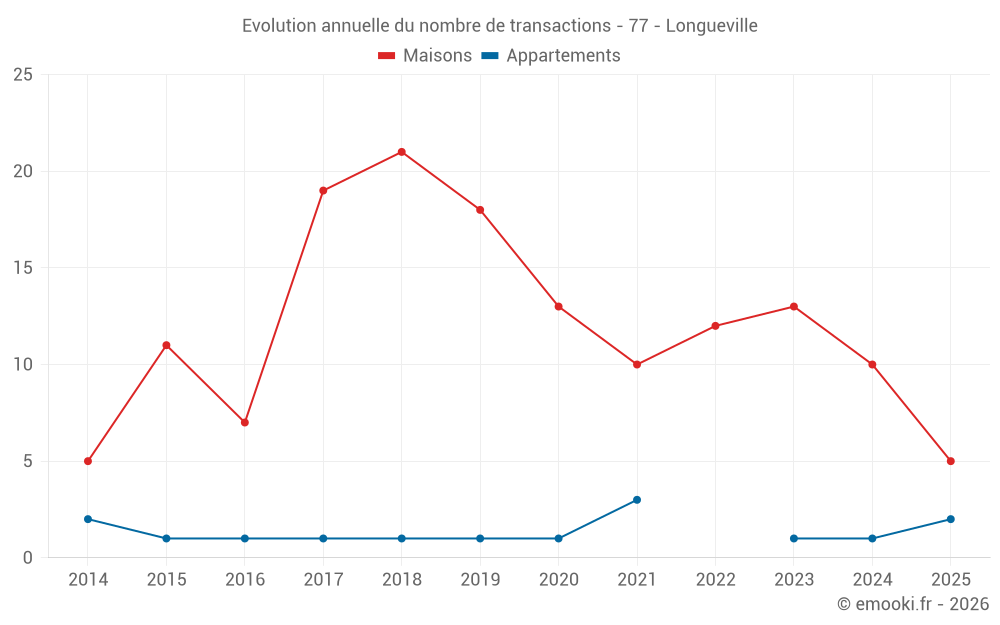 Le prix médian sur les 21 transactions de maisons des 24 derniers mois dans la commune de Longueville était de 2 093 € par mètre carré pour une valeur foncière médiane de 165 000 €. Sur cette période 60% des transactions se sont situées entre 1 558 et 2 378 € par mètre carré (du 2ème au 8ème déciles).