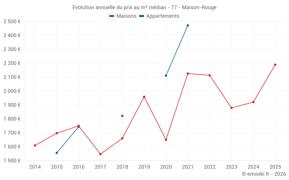 Le prix médian sur les 16 transactions de maisons des 24 derniers mois dans la commune de Maison-Rouge était de 1 921 € par mètre carré pour une valeur foncière médiane de 174 895 €. Sur cette période 60% des transactions se sont situées entre 845 et 2 253 € par mètre carré (du 2ème au 8ème déciles).
