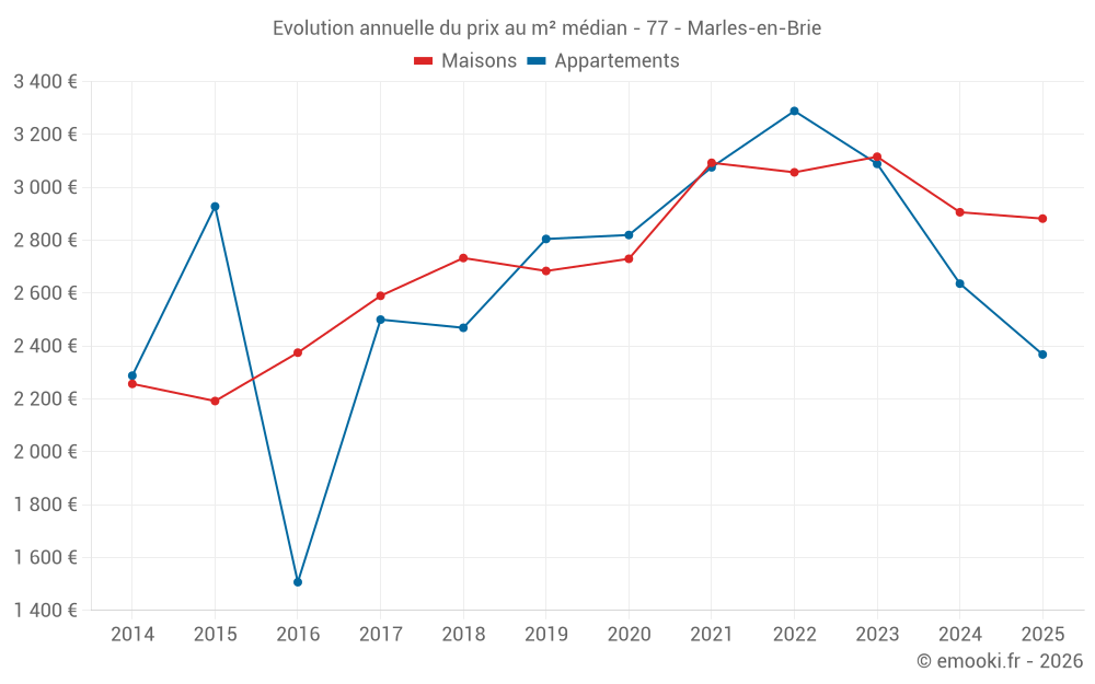 Le prix médian sur les 16 transactions de maisons des 12 derniers mois dans la commune de Marles-en-Brie était de 2 970 € par mètre carré pour une valeur foncière médiane de 295 000 €. Sur cette période 60% des transactions se sont situées entre 2 273 et 3 083 € par mètre carré (du 2ème au 8ème déciles).
