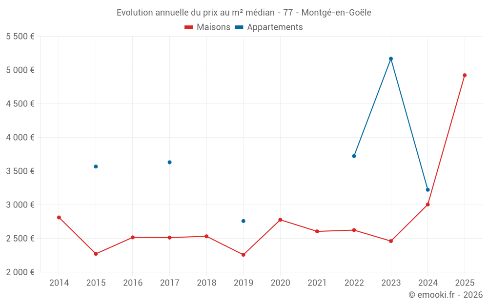 Le prix médian sur les 16 transactions de maisons des 24 derniers mois dans la commune de Montgé-en-Goële était de 2 906 € par mètre carré pour une valeur foncière médiane de 288 500 €. Sur cette période 60% des transactions se sont situées entre 2 480 et 3 472 € par mètre carré (du 2ème au 8ème déciles).