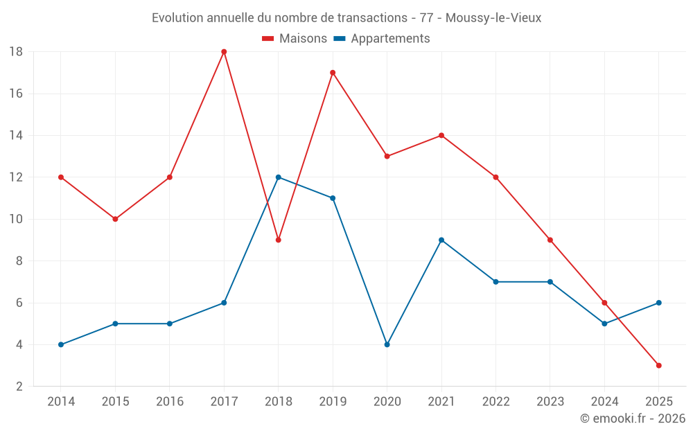 Le prix médian sur les 14 transactions de maisons des 24 derniers mois dans la commune de Moussy-le-Vieux était de 2 952 € par mètre carré pour une valeur foncière médiane de 312 500 €. Sur cette période 60% des transactions se sont situées entre 2 559 et 3 465 € par mètre carré (du 2ème au 8ème déciles).