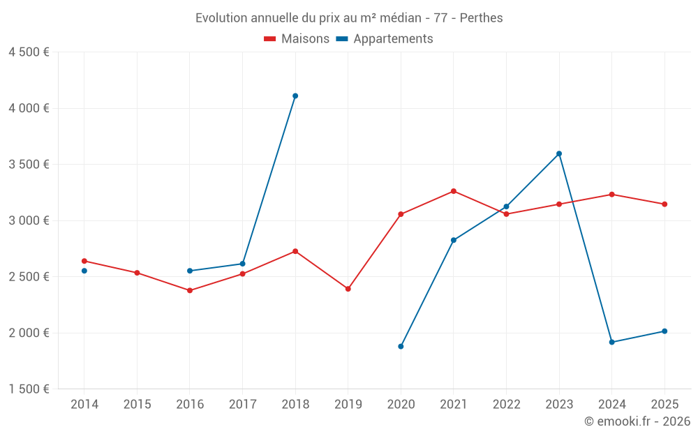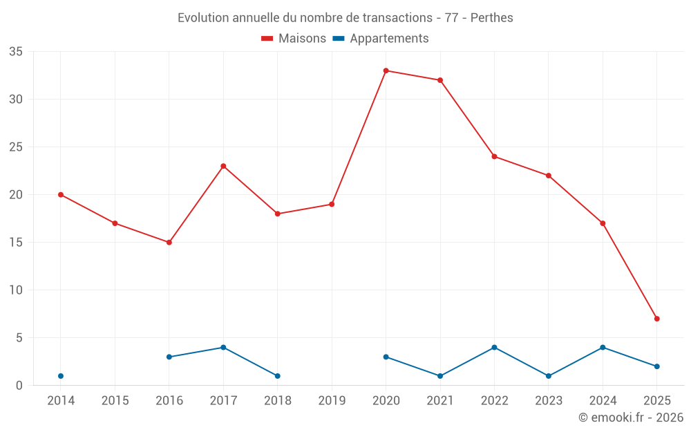 Le prix médian sur les 38 transactions de maisons des 24 derniers mois dans la commune de Perthes était de 3 184 € par mètre carré pour une valeur foncière médiane de 311 685 €. Sur cette période 60% des transactions se sont situées entre 2 598 et 3 625 € par mètre carré (du 2ème au 8ème déciles).