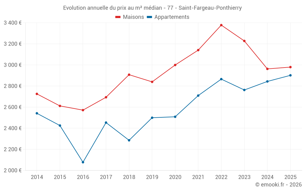 Le prix médian sur les 44 transactions d'appartements des 6 derniers mois dans la commune de Saint-Fargeau-Ponthierry était de 2 902 € par mètre carré pour une valeur foncière médiane de 129 140 €. Sur cette période 60% des transactions se sont situées entre 2 227 et 3 364 € par mètre carré (du 2ème au 8ème déciles).