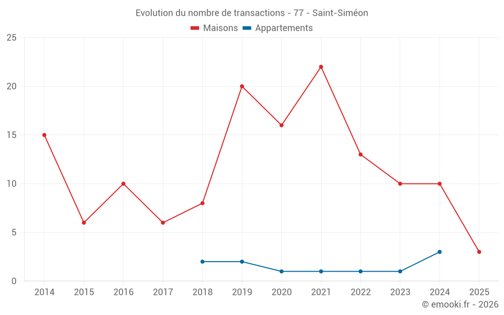 Le prix médian sur les 21 transactions de maisons des 24 derniers mois dans la commune de Saint-Siméon était de 1 744 € par mètre carré pour une valeur foncière médiane de 200 000 €. Sur cette période 60% des transactions se sont situées entre 1 413 et 2 533 € par mètre carré (du 2ème au 8ème déciles).