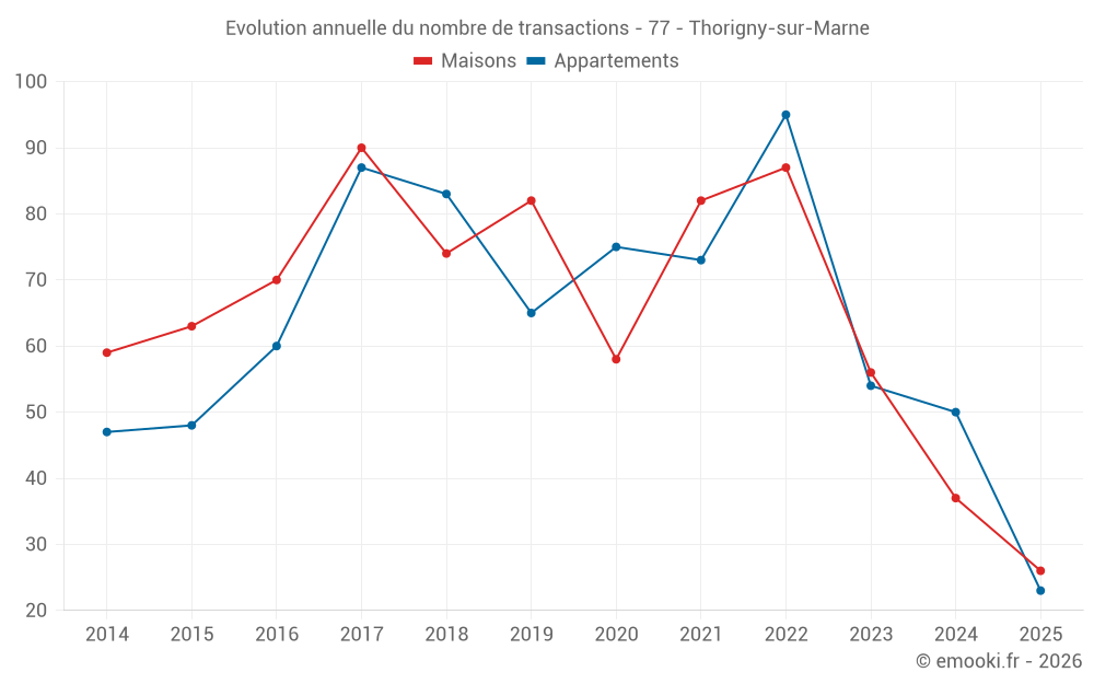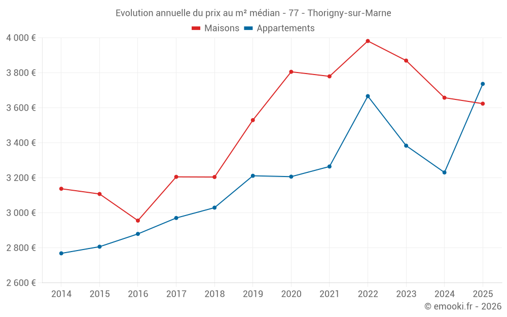 Le prix médian sur les 26 transactions de maisons des 6 derniers mois dans la commune de Thorigny-sur-Marne était de 3 624 € par mètre carré pour une valeur foncière médiane de 364 000 €. Sur cette période 60% des transactions se sont situées entre 3 051 et 4 737 € par mètre carré (du 2ème au 8ème déciles).