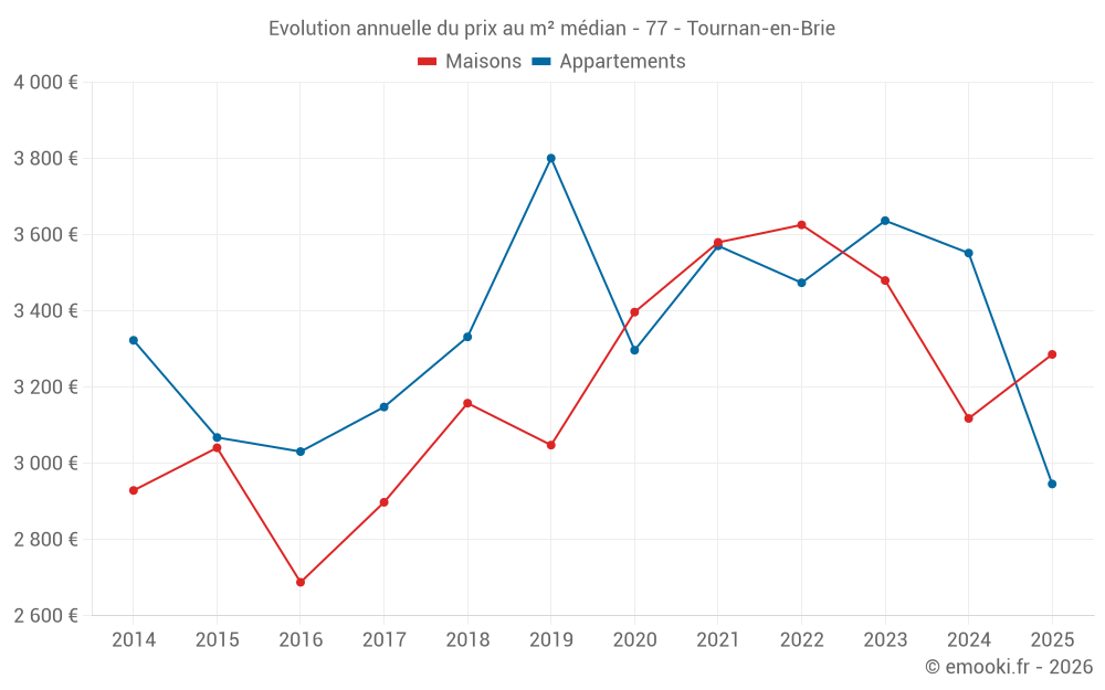 Le prix médian sur les 26 transactions d'appartements des 12 derniers mois dans la commune de Tournan-en-Brie était de 3 451 € par mètre carré pour une valeur foncière médiane de 164 000 €. Sur cette période 60% des transactions se sont situées entre 2 772 et 3 811 € par mètre carré (du 2ème au 8ème déciles).