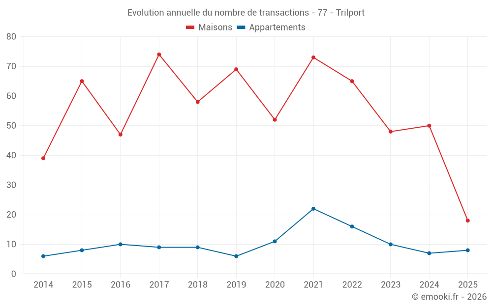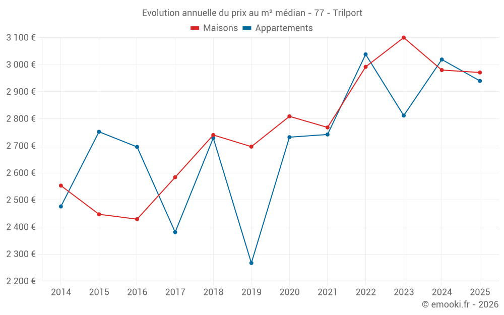 Le prix médian sur les 18 transactions de maisons des 6 derniers mois dans la commune de Trilport était de 2 971 € par mètre carré pour une valeur foncière médiane de 278 750 €. Sur cette période 60% des transactions se sont situées entre 2 374 et 3 697 € par mètre carré (du 2ème au 8ème déciles).