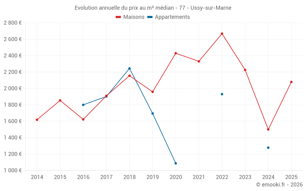 Le prix médian sur les 15 transactions de maisons des 24 derniers mois dans la commune d'Ussy-sur-Marne était de 2 079 € par mètre carré pour une valeur foncière médiane de 210 000 €. Sur cette période 60% des transactions se sont situées entre 1 403 et 2 463 € par mètre carré (du 2ème au 8ème déciles).