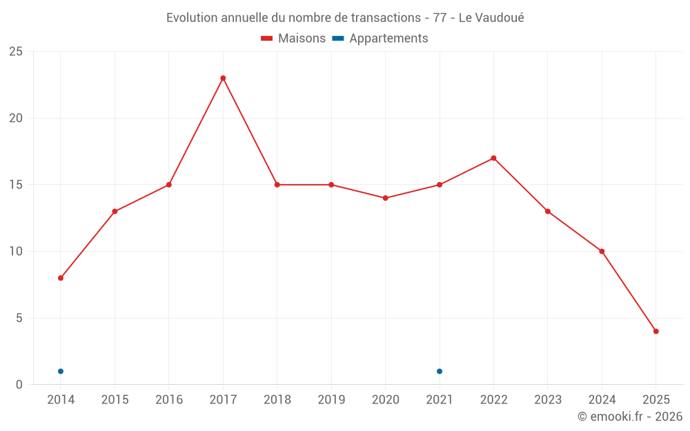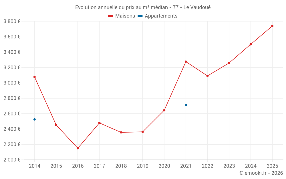 Le prix médian sur les 22 transactions de maisons des 24 derniers mois dans la commune du Vaudoué était de 3 502 € par mètre carré pour une valeur foncière médiane de 280 000 €. Sur cette période 60% des transactions se sont situées entre 2 381 et 5 221 € par mètre carré (du 2ème au 8ème déciles).