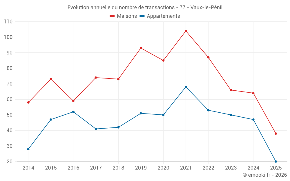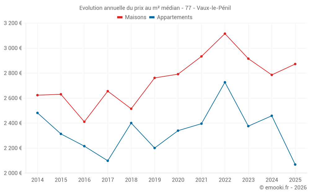 Le prix médian sur les 38 transactions de maisons des 6 derniers mois dans la commune de Vaux-le-Pénil était de 2 873 € par mètre carré pour une valeur foncière médiane de 289 500 €. Sur cette période 60% des transactions se sont situées entre 2 403 et 3 469 € par mètre carré (du 2ème au 8ème déciles).