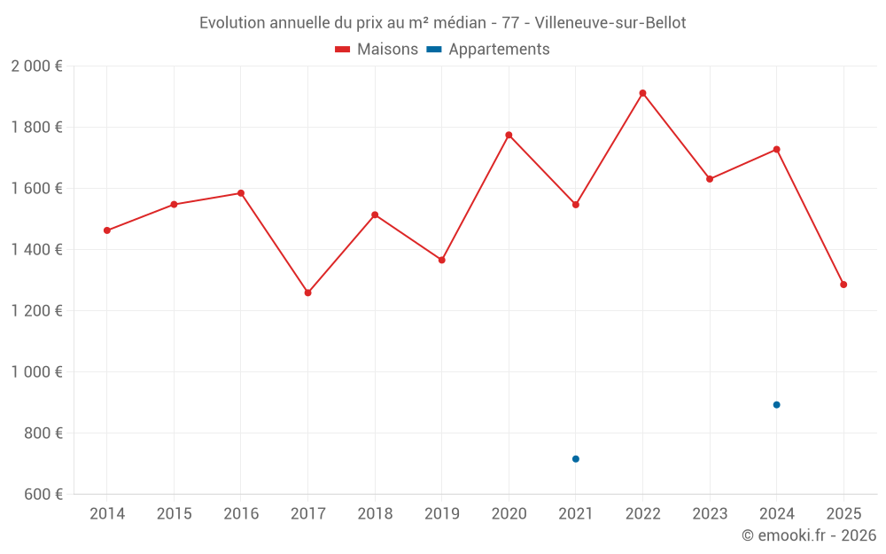 Le prix médian sur les 23 transactions de maisons des 24 derniers mois dans la commune de Villeneuve-sur-Bellot était de 1 728 € par mètre carré pour une valeur foncière médiane de 155 000 €. Sur cette période 60% des transactions se sont situées entre 1 108 et 2 219 € par mètre carré (du 2ème au 8ème déciles).