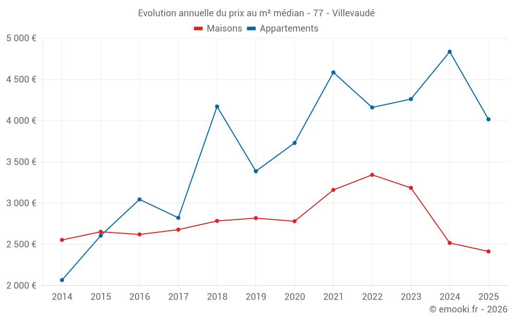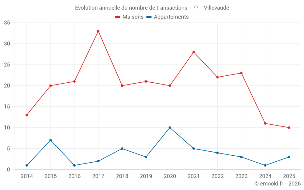 Le prix médian sur les 17 transactions de maisons des 12 derniers mois dans la commune de Villevaudé était de 2 486 € par mètre carré pour une valeur foncière médiane de 310 000 €. Sur cette période 60% des transactions se sont situées entre 1 980 et 4 043 € par mètre carré (du 2ème au 8ème déciles).