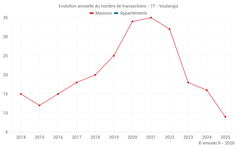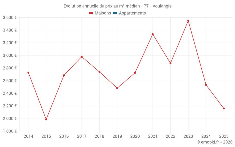 Le prix médian sur les 20 transactions de maisons des 12 derniers mois dans la commune de Voulangis était de 2 375 € par mètre carré pour une valeur foncière médiane de 282 585 €. Sur cette période 60% des transactions se sont situées entre 1 112 et 3 313 € par mètre carré (du 2ème au 8ème déciles).