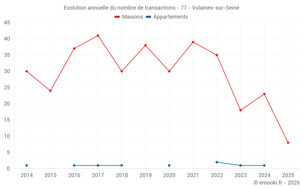 Le prix médian sur les 18 transactions de maisons des 12 derniers mois dans la commune de Vulaines-sur-Seine était de 3 128 € par mètre carré pour une valeur foncière médiane de 324 000 €. Sur cette période 60% des transactions se sont situées entre 2 884 et 3 459 € par mètre carré (du 2ème au 8ème déciles).