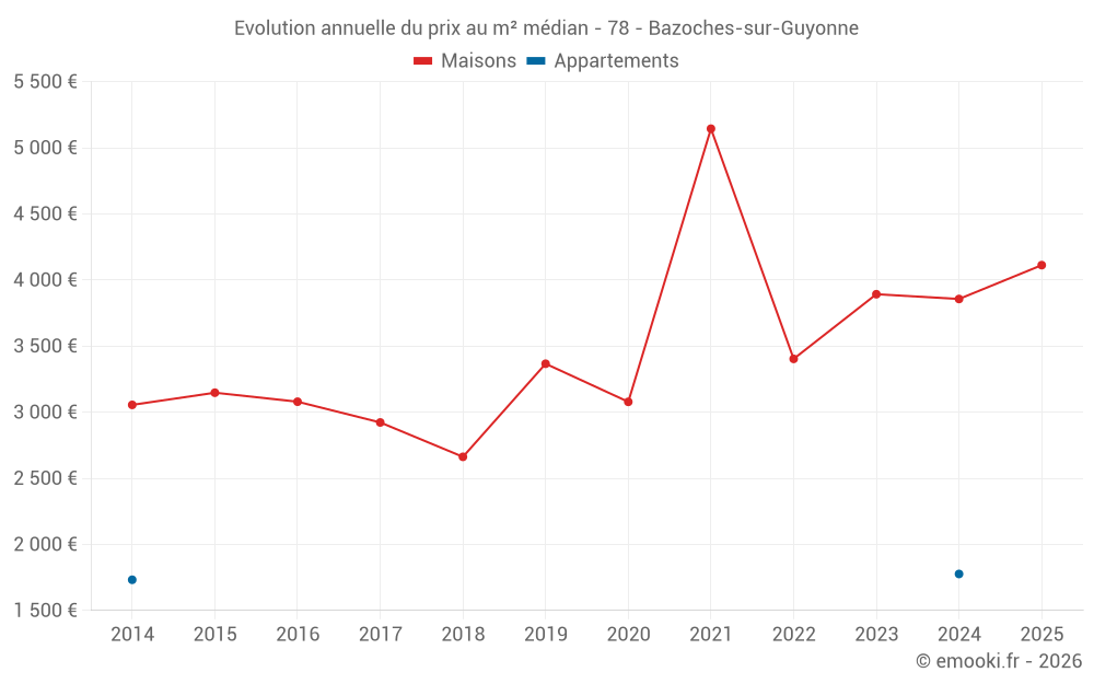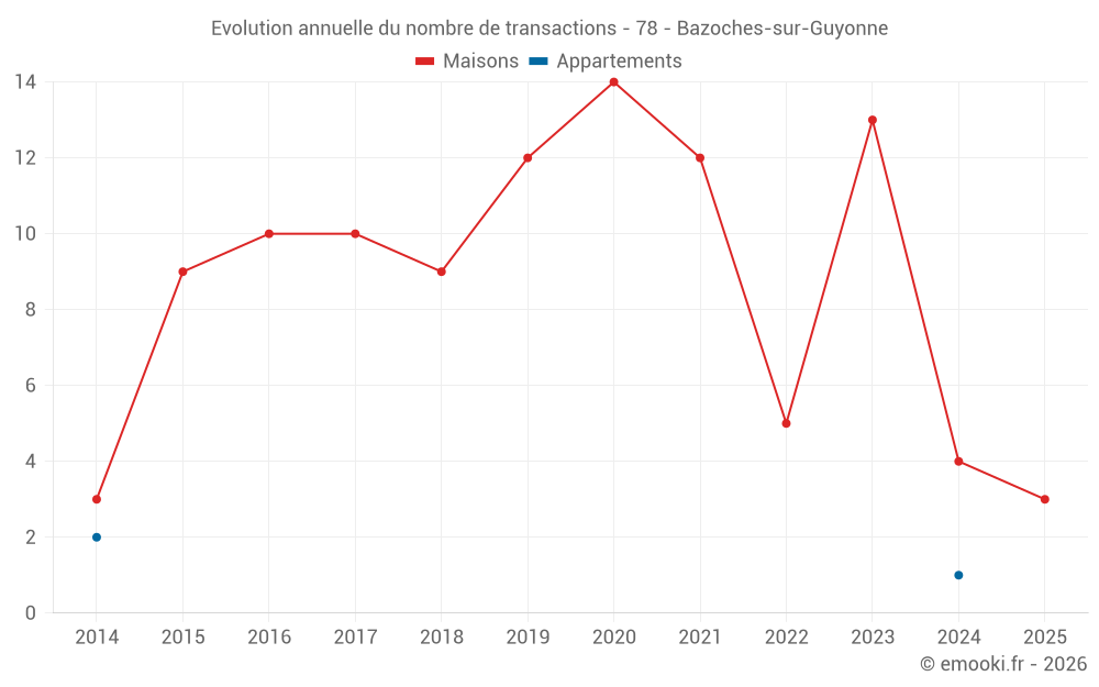 Le prix médian sur les 14 transactions de maisons des 24 derniers mois dans la commune de Bazoches-sur-Guyonne était de 4 002 € par mètre carré pour une valeur foncière médiane de 534 000 €. Sur cette période 60% des transactions se sont situées entre 3 238 et 4 891 € par mètre carré (du 2ème au 8ème déciles).