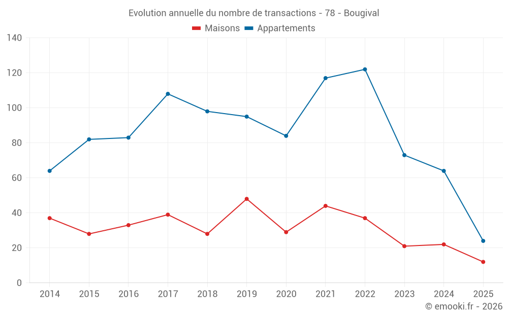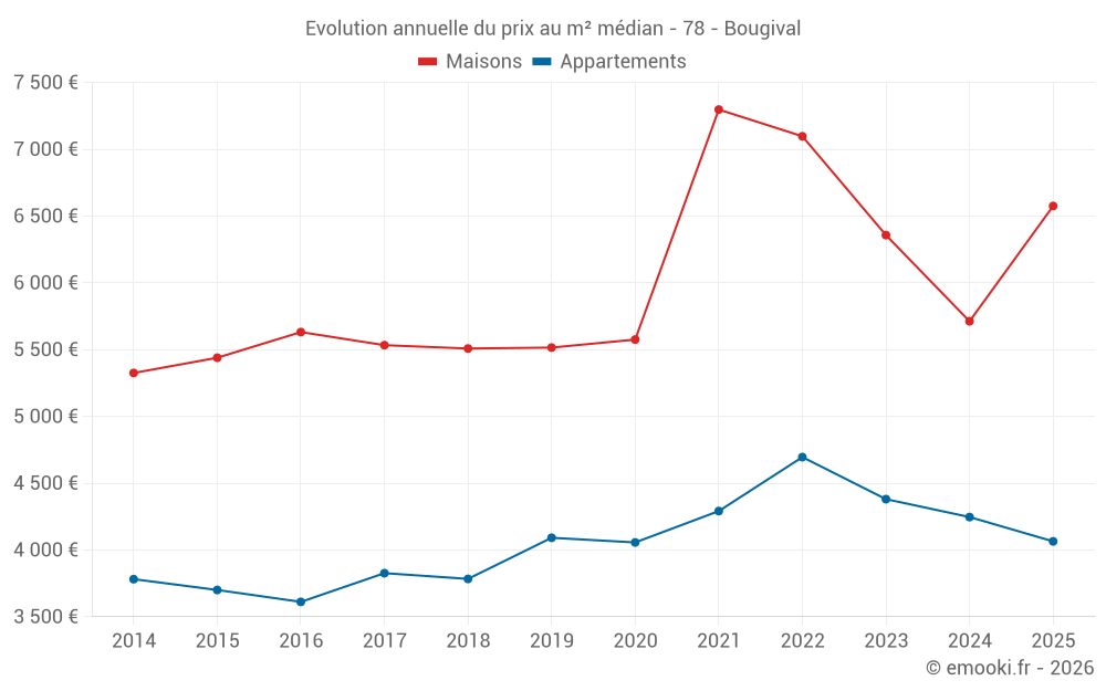 Le prix médian sur les 22 transactions de maisons des 12 derniers mois dans la commune de Bougival était de 6 318 € par mètre carré pour une valeur foncière médiane de 804 250 €. Sur cette période 60% des transactions se sont situées entre 5 451 et 7 821 € par mètre carré (du 2ème au 8ème déciles).