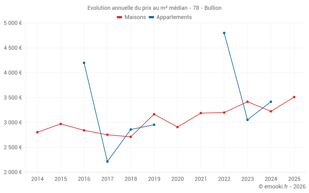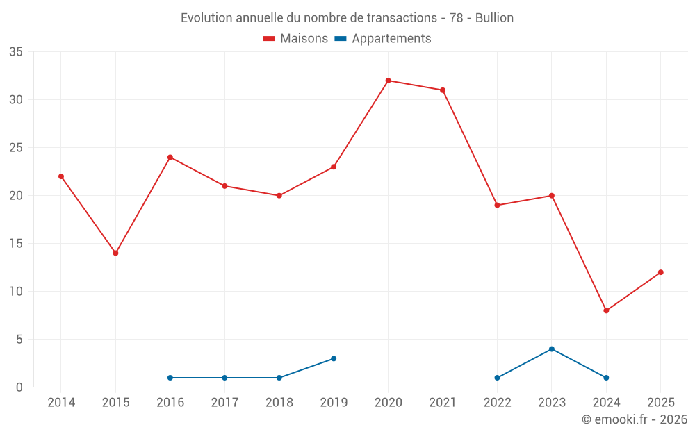 Le prix médian sur les 29 transactions de maisons des 24 derniers mois dans la commune de Bullion était de 3 221 € par mètre carré pour une valeur foncière médiane de 320 000 €. Sur cette période 60% des transactions se sont situées entre 2 281 et 4 448 € par mètre carré (du 2ème au 8ème déciles).