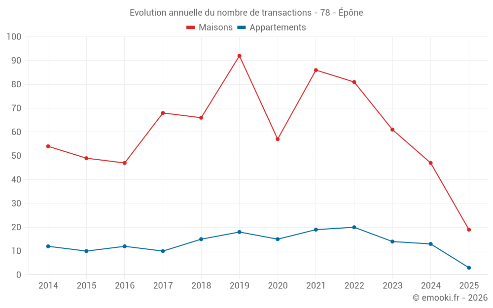 Le prix médian sur les 19 transactions de maisons des 6 derniers mois dans la commune d'Épône était de 3 051 € par mètre carré pour une valeur foncière médiane de 270 000 €. Sur cette période 60% des transactions se sont situées entre 2 705 et 3 419 € par mètre carré (du 2ème au 8ème déciles).
