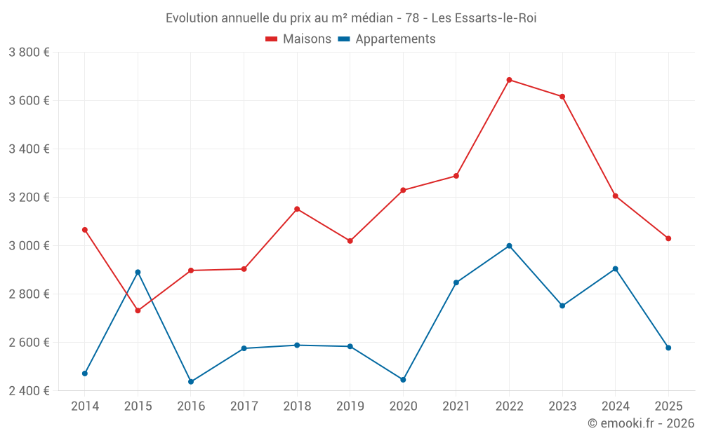 Le prix médian sur les 18 transactions d'appartements des 12 derniers mois dans la commune des Essarts-le-Roi était de 2 823 € par mètre carré pour une valeur foncière médiane de 184 030 €. Sur cette période 60% des transactions se sont situées entre 2 520 et 3 553 € par mètre carré (du 2ème au 8ème déciles).