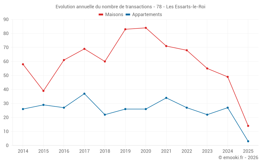 Le prix médian sur les 44 transactions de maisons des 12 derniers mois dans la commune des Essarts-le-Roi était de 3 171 € par mètre carré pour une valeur foncière médiane de 357 955 €. Sur cette période 60% des transactions se sont situées entre 2 411 et 3 807 € par mètre carré (du 2ème au 8ème déciles).