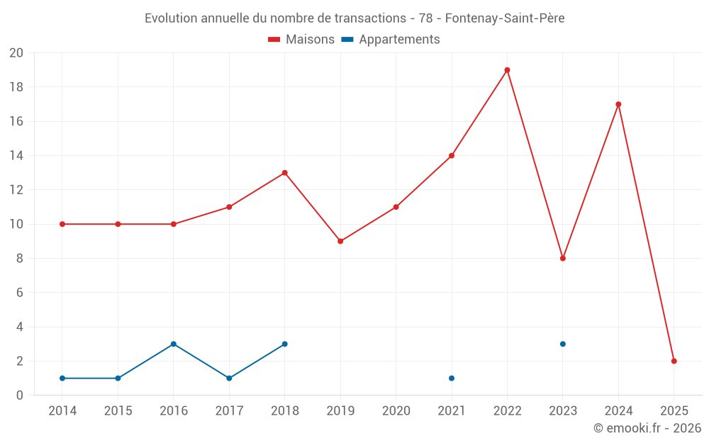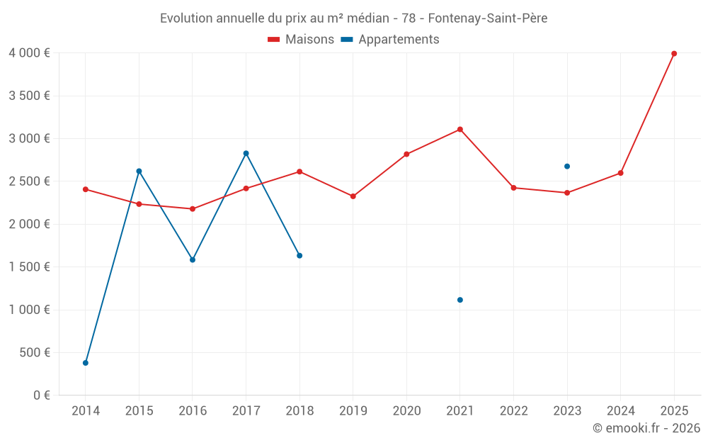 Le prix médian sur les 22 transactions de maisons des 24 derniers mois dans la commune de Fontenay-Saint-Père était de 2 647 € par mètre carré pour une valeur foncière médiane de 289 500 €. Sur cette période 60% des transactions se sont situées entre 1 812 et 3 407 € par mètre carré (du 2ème au 8ème déciles).