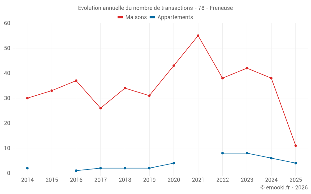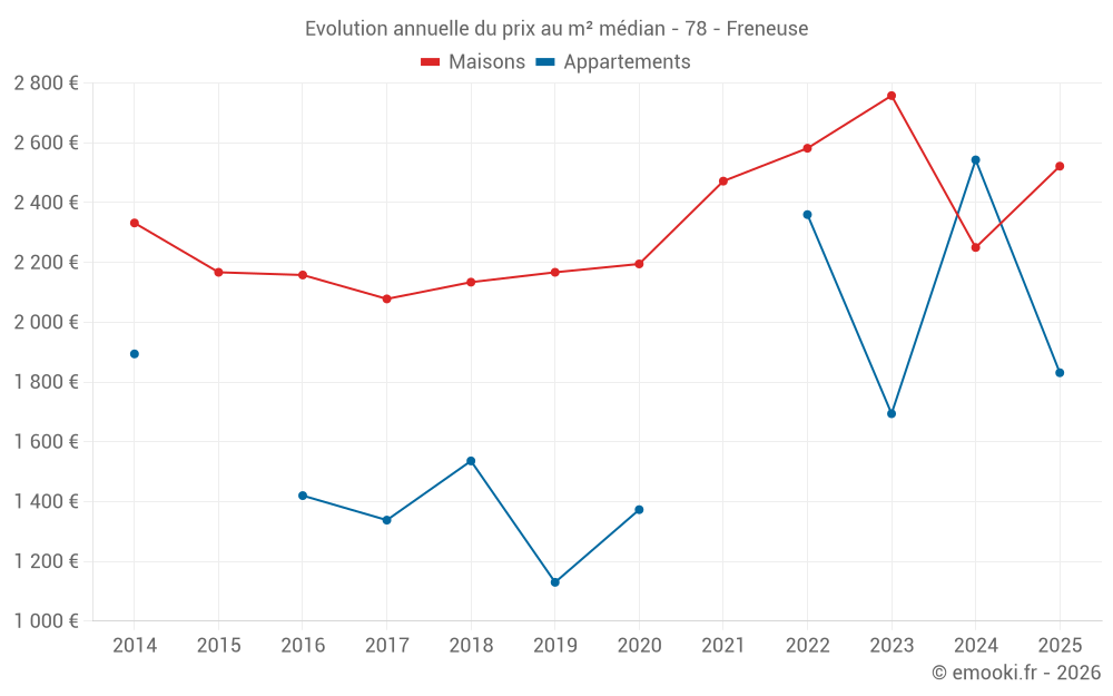 Le prix médian sur les 15 transactions d'appartements des 24 derniers mois dans la commune de Freneuse était de 2 313 € par mètre carré pour une valeur foncière médiane de 161 000 €. Sur cette période 60% des transactions se sont situées entre 1 164 et 2 616 € par mètre carré (du 2ème au 8ème déciles).