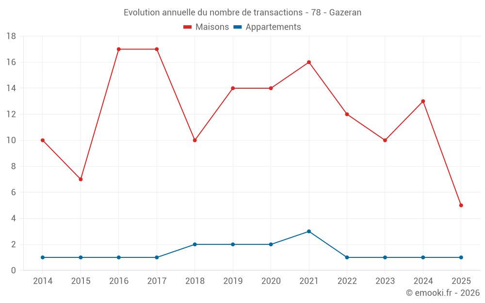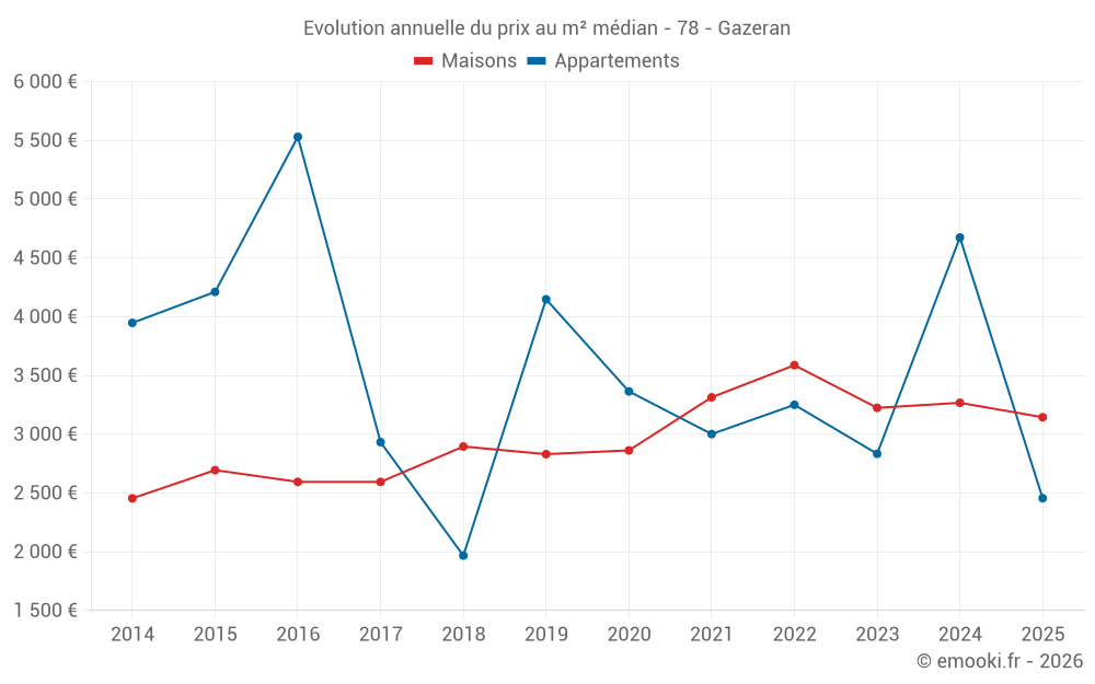 Le prix médian sur les 23 transactions de maisons des 24 derniers mois dans la commune de Gazeran était de 3 267 € par mètre carré pour une valeur foncière médiane de 380 000 €. Sur cette période 60% des transactions se sont situées entre 2 726 et 3 709 € par mètre carré (du 2ème au 8ème déciles).