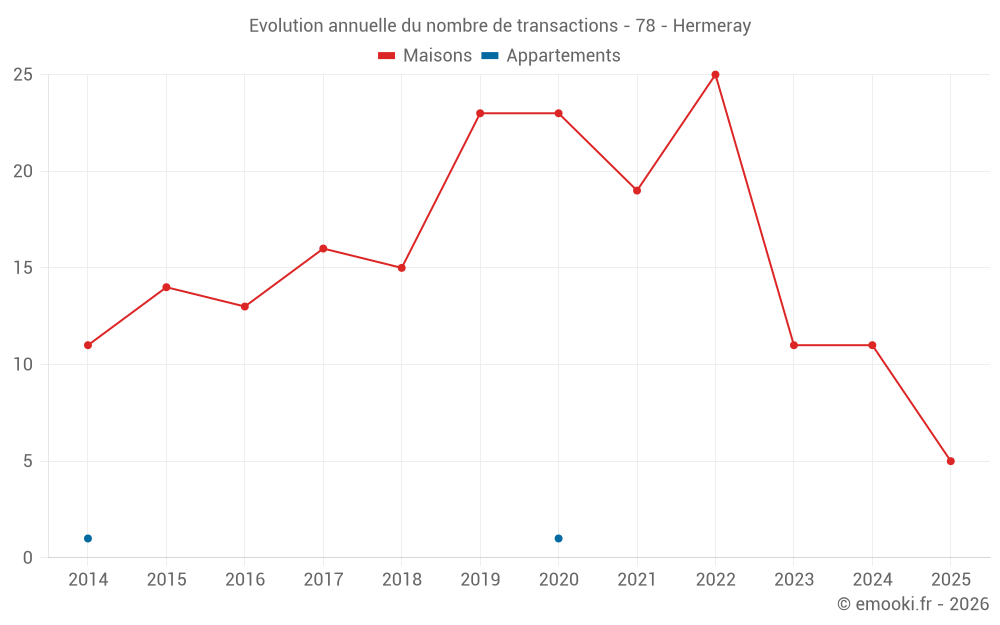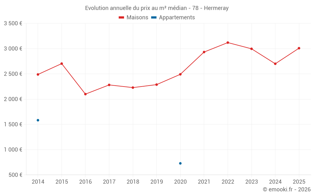 Le prix médian sur les 20 transactions de maisons des 24 derniers mois dans la commune d'Hermeray était de 2 809 € par mètre carré pour une valeur foncière médiane de 350 575 €. Sur cette période 60% des transactions se sont situées entre 2 474 et 3 430 € par mètre carré (du 2ème au 8ème déciles).