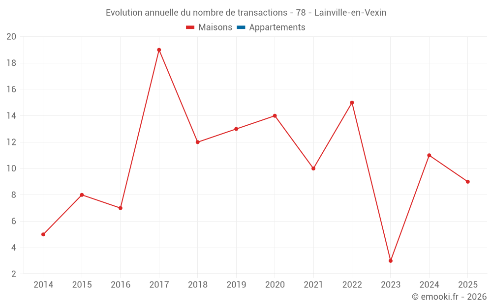 Le prix médian sur les 17 transactions de maisons des 12 derniers mois dans la commune de Lainville-en-Vexin était de 2 560 € par mètre carré pour une valeur foncière médiane de 315 000 €. Sur cette période 60% des transactions se sont situées entre 2 086 et 3 207 € par mètre carré (du 2ème au 8ème déciles).