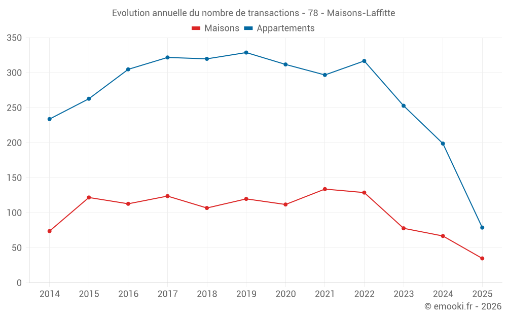 Le prix médian sur les 39 transactions d'appartements des 3 derniers mois dans la commune de Maisons-Laffitte était de 5 250 € par mètre carré pour une valeur foncière médiane de 310 906 €. Sur cette période 60% des transactions se sont situées entre 4 488 et 6 686 € par mètre carré (du 2ème au 8ème déciles).