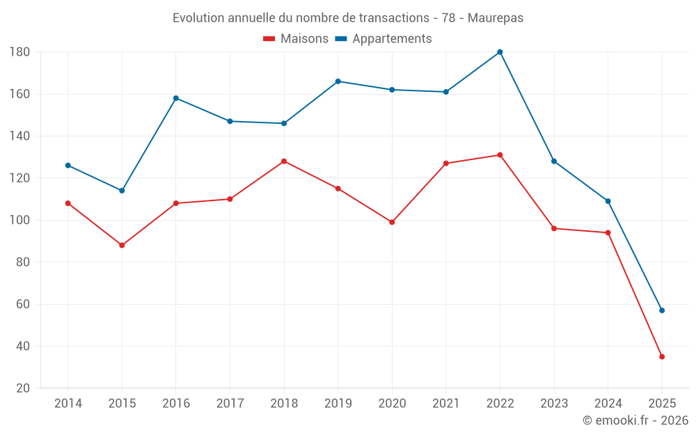 Le prix médian sur les 35 transactions de maisons des 6 derniers mois dans la commune de Maurepas était de 3 208 € par mètre carré pour une valeur foncière médiane de 340 000 €. Sur cette période 60% des transactions se sont situées entre 2 729 et 3 898 € par mètre carré (du 2ème au 8ème déciles).