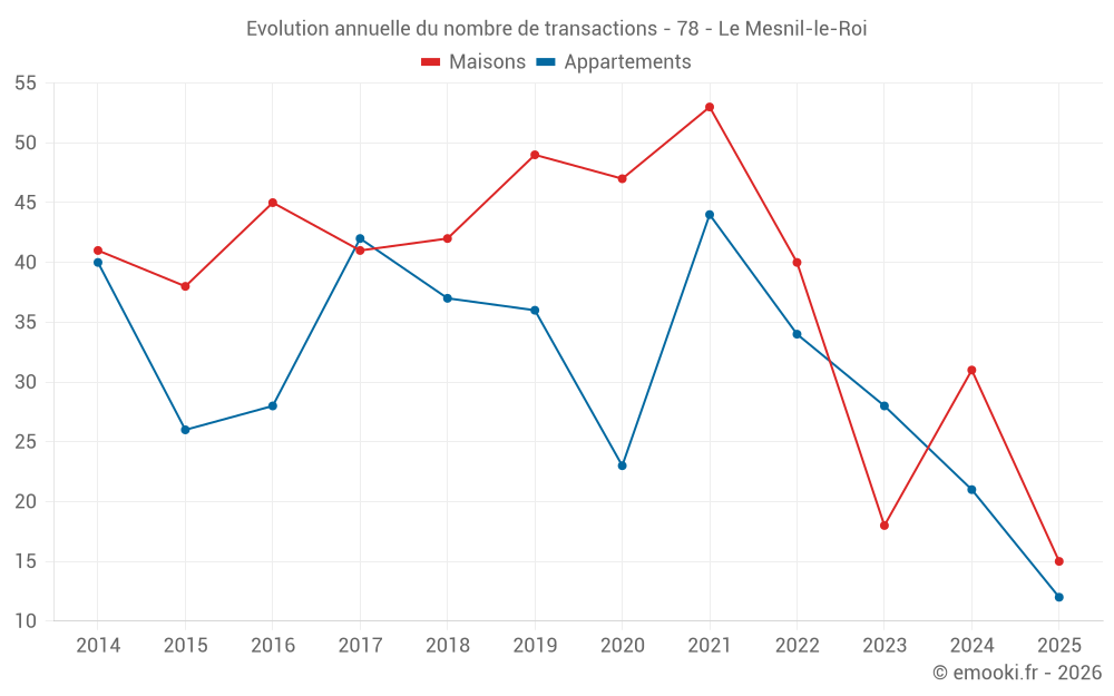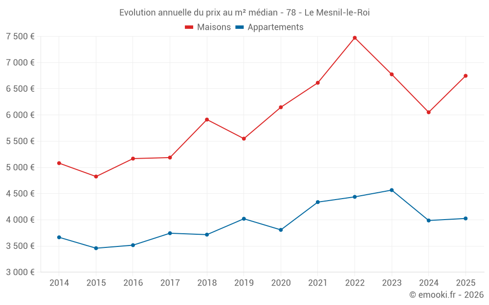 Le prix médian sur les 35 transactions de maisons des 12 derniers mois dans la commune du Mesnil-le-Roi était de 6 748 € par mètre carré pour une valeur foncière médiane de 838 180 €. Sur cette période 60% des transactions se sont situées entre 5 042 et 7 554 € par mètre carré (du 2ème au 8ème déciles).