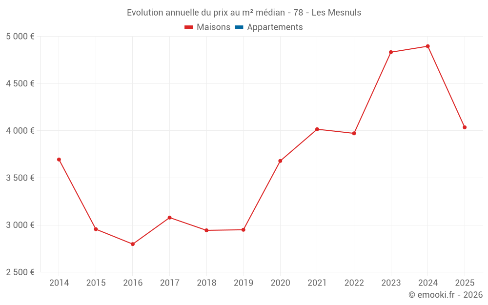Le prix médian sur les 14 transactions de maisons des 24 derniers mois dans la commune des Mesnuls était de 4 708 € par mètre carré pour une valeur foncière médiane de 520 000 €. Sur cette période 60% des transactions se sont situées entre 4 115 et 5 018 € par mètre carré (du 2ème au 8ème déciles).