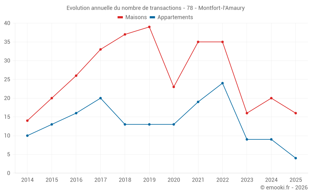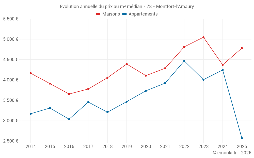 Le prix médian sur les 18 transactions d'appartements des 24 derniers mois dans la commune de Montfort-l'Amaury était de 3 899 € par mètre carré pour une valeur foncière médiane de 211 000 €. Sur cette période 60% des transactions se sont situées entre 2 693 et 5 057 € par mètre carré (du 2ème au 8ème déciles).