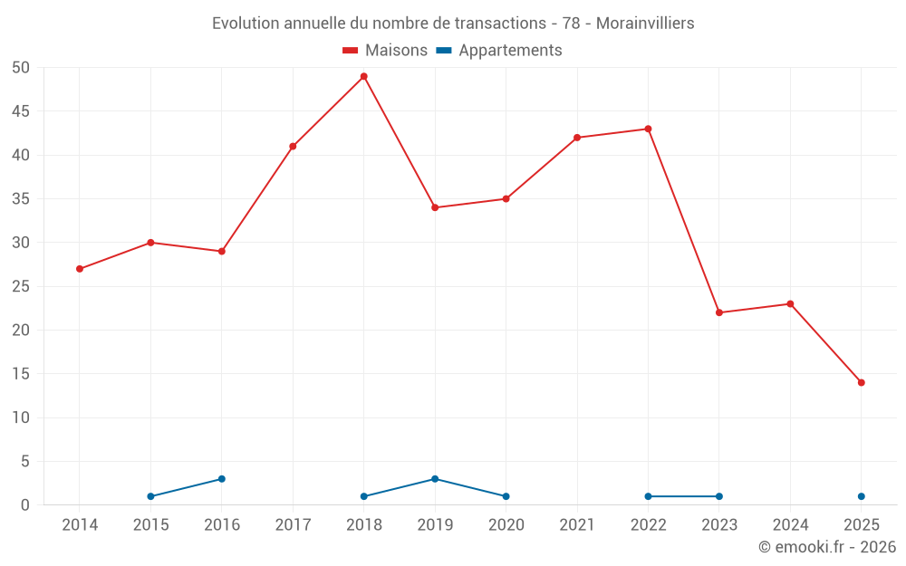 Le prix médian sur les 25 transactions de maisons des 12 derniers mois dans la commune de Morainvilliers était de 3 887 € par mètre carré pour une valeur foncière médiane de 540 000 €. Sur cette période 60% des transactions se sont situées entre 3 225 et 4 328 € par mètre carré (du 2ème au 8ème déciles).