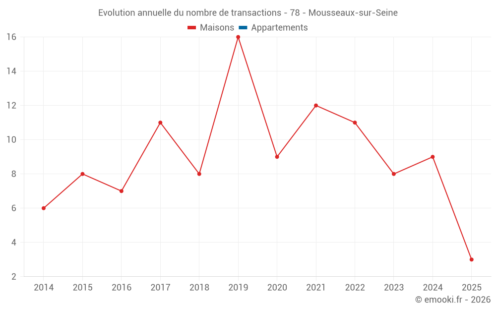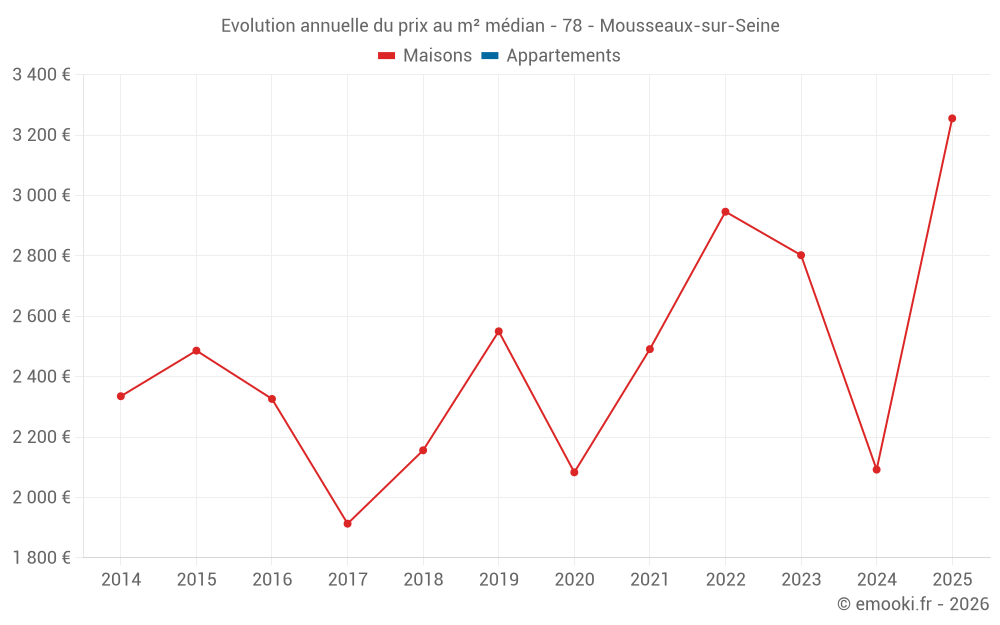 Le prix médian sur les 15 transactions de maisons des 24 derniers mois dans la commune de Mousseaux-sur-Seine était de 2 799 € par mètre carré pour une valeur foncière médiane de 230 800 €. Sur cette période 60% des transactions se sont situées entre 1 510 et 3 267 € par mètre carré (du 2ème au 8ème déciles).