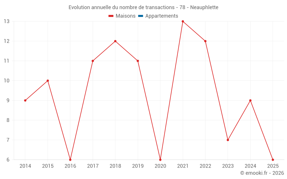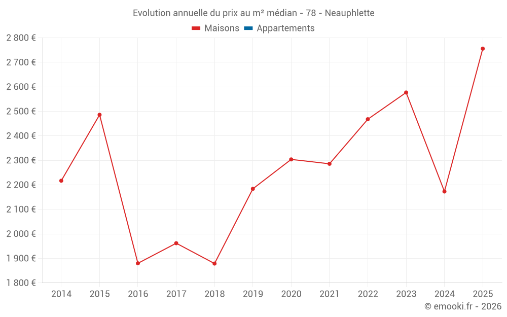 Le prix médian sur les 17 transactions de maisons des 24 derniers mois dans la commune de Neauphlette était de 2 276 € par mètre carré pour une valeur foncière médiane de 269 900 €. Sur cette période 60% des transactions se sont situées entre 1 704 et 2 959 € par mètre carré (du 2ème au 8ème déciles).