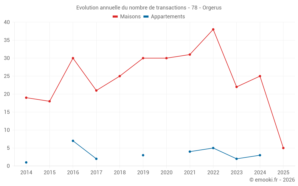 Le prix médian sur les 18 transactions de maisons des 12 derniers mois dans la commune d'Orgerus était de 3 060 € par mètre carré pour une valeur foncière médiane de 275 000 €. Sur cette période 60% des transactions se sont situées entre 2 664 et 3 726 € par mètre carré (du 2ème au 8ème déciles).