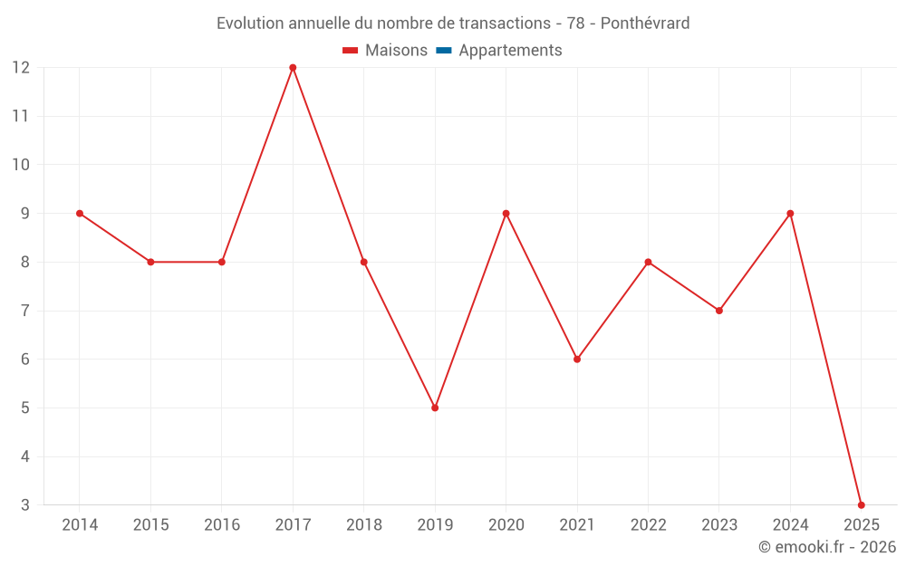 Le prix médian sur les 16 transactions de maisons des 24 derniers mois dans la commune de Ponthévrard était de 2 784 € par mètre carré pour une valeur foncière médiane de 327 500 €. Sur cette période 60% des transactions se sont situées entre 2 235 et 3 185 € par mètre carré (du 2ème au 8ème déciles).