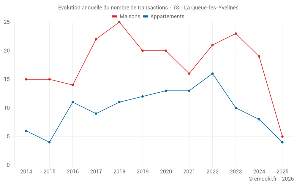 Le prix médian sur les 19 transactions d'appartements des 24 derniers mois dans la commune de la Queue-les-Yvelines était de 3 889 € par mètre carré pour une valeur foncière médiane de 185 000 €. Sur cette période 60% des transactions se sont situées entre 3 047 et 4 260 € par mètre carré (du 2ème au 8ème déciles).