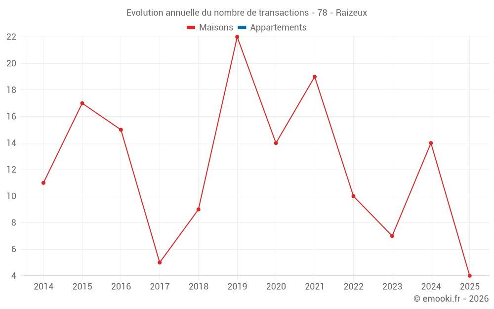 Le prix médian sur les 22 transactions de maisons des 24 derniers mois dans la commune de Raizeux était de 2 712 € par mètre carré pour une valeur foncière médiane de 315 100 €. Sur cette période 60% des transactions se sont situées entre 2 003 et 4 118 € par mètre carré (du 2ème au 8ème déciles).