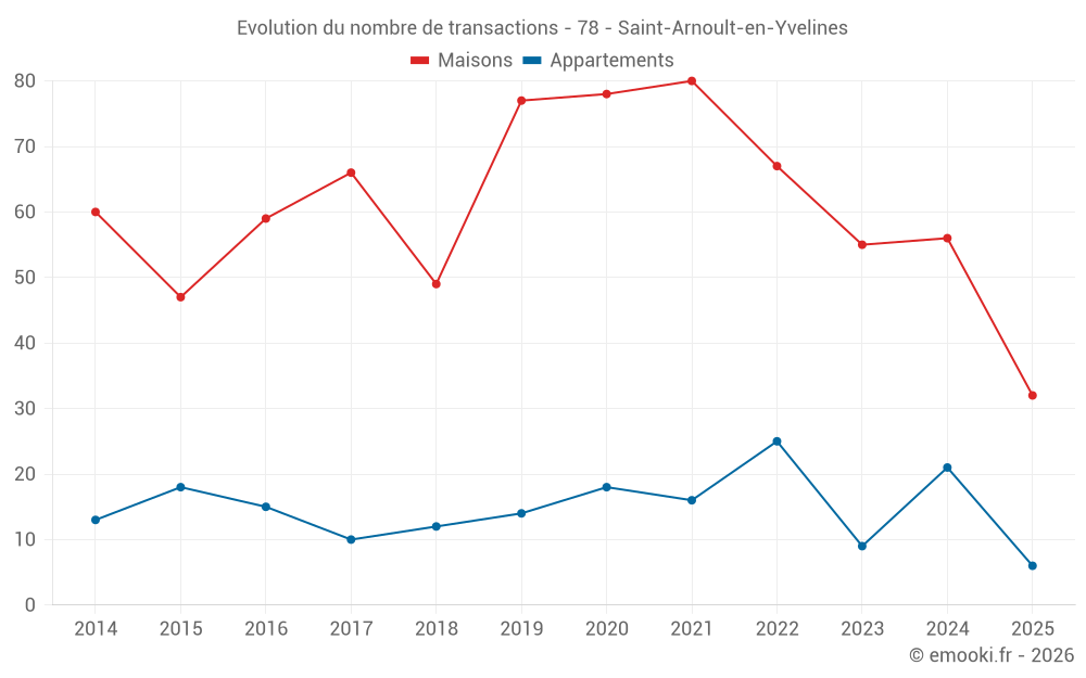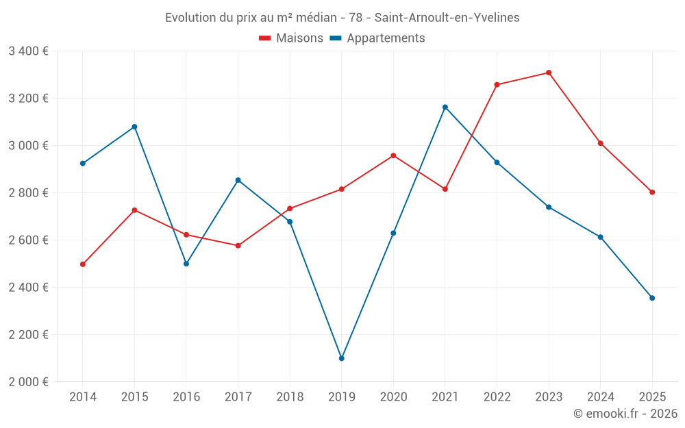 Le prix médian sur les 32 transactions de maisons des 6 derniers mois dans la commune de Saint-Arnoult-en-Yvelines était de 2 803 € par mètre carré pour une valeur foncière médiane de 309 298 €. Sur cette période 60% des transactions se sont situées entre 2 274 et 3 381 € par mètre carré (du 2ème au 8ème déciles).
