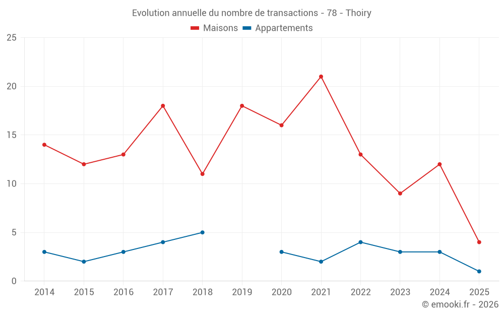 Le prix médian sur les 18 transactions de maisons des 24 derniers mois dans la commune de Thoiry était de 3 230 € par mètre carré pour une valeur foncière médiane de 354 500 €. Sur cette période 60% des transactions se sont situées entre 2 520 et 3 653 € par mètre carré (du 2ème au 8ème déciles).