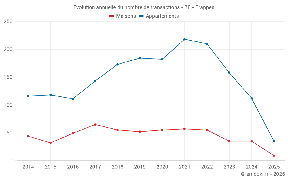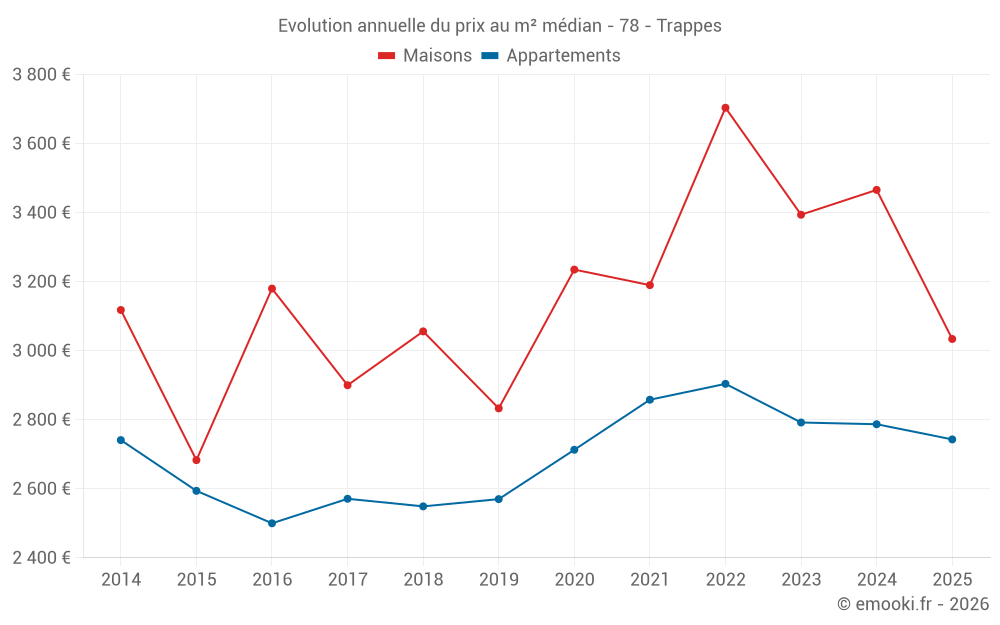 Le prix médian sur les 34 transactions de maisons des 12 derniers mois dans la commune de Trappes était de 3 285 € par mètre carré pour une valeur foncière médiane de 307 100 €. Sur cette période 60% des transactions se sont situées entre 2 751 et 4 130 € par mètre carré (du 2ème au 8ème déciles).