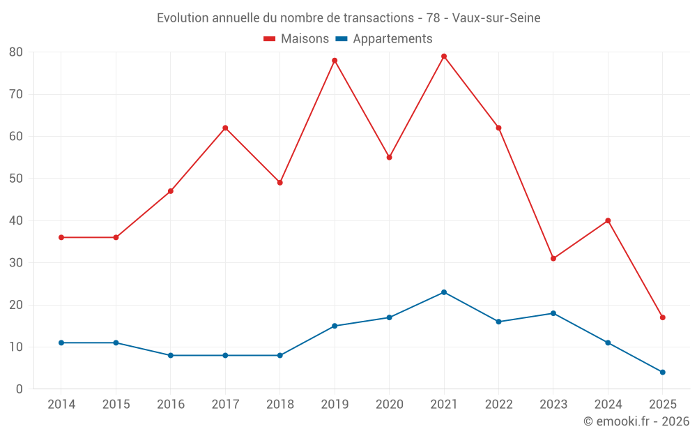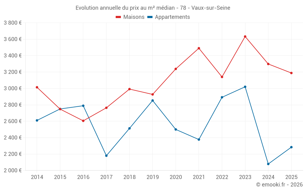 Le prix médian sur les 31 transactions de maisons des 12 derniers mois dans la commune de Vaux-sur-Seine était de 3 329 € par mètre carré pour une valeur foncière médiane de 340 000 €. Sur cette période 60% des transactions se sont situées entre 2 469 et 4 558 € par mètre carré (du 2ème au 8ème déciles).