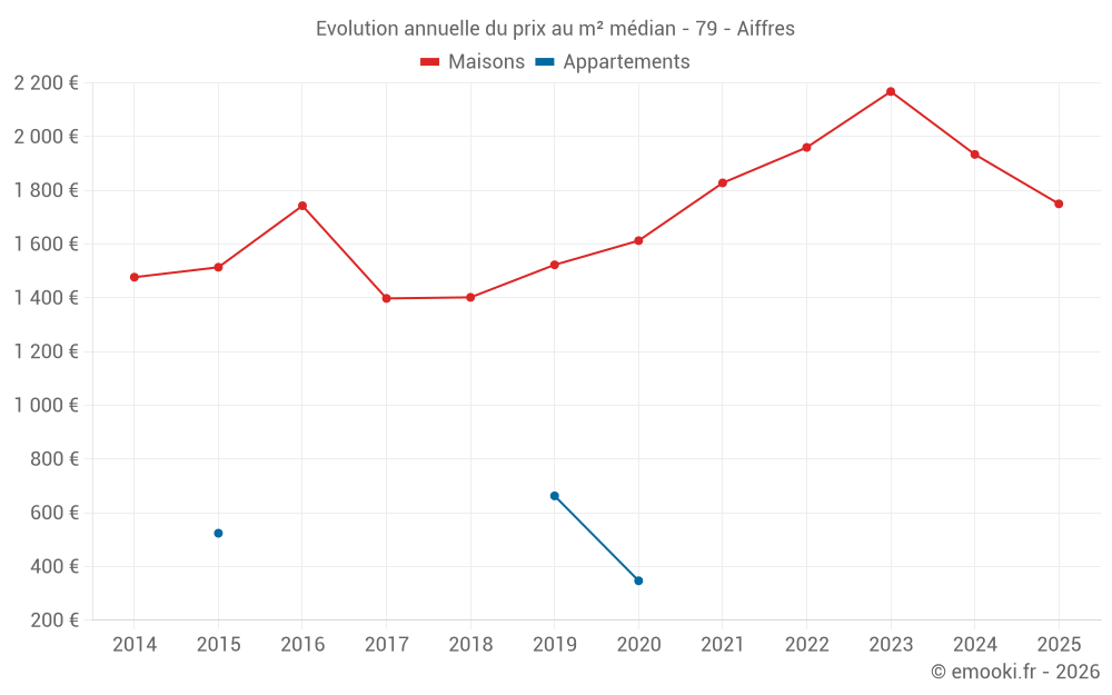 Le prix médian sur les 21 transactions de maisons des 6 derniers mois dans la commune d'Aiffres était de 1 750 € par mètre carré pour une valeur foncière médiane de 210 040 €. Sur cette période 60% des transactions se sont situées entre 1 500 et 2 312 € par mètre carré (du 2ème au 8ème déciles).
