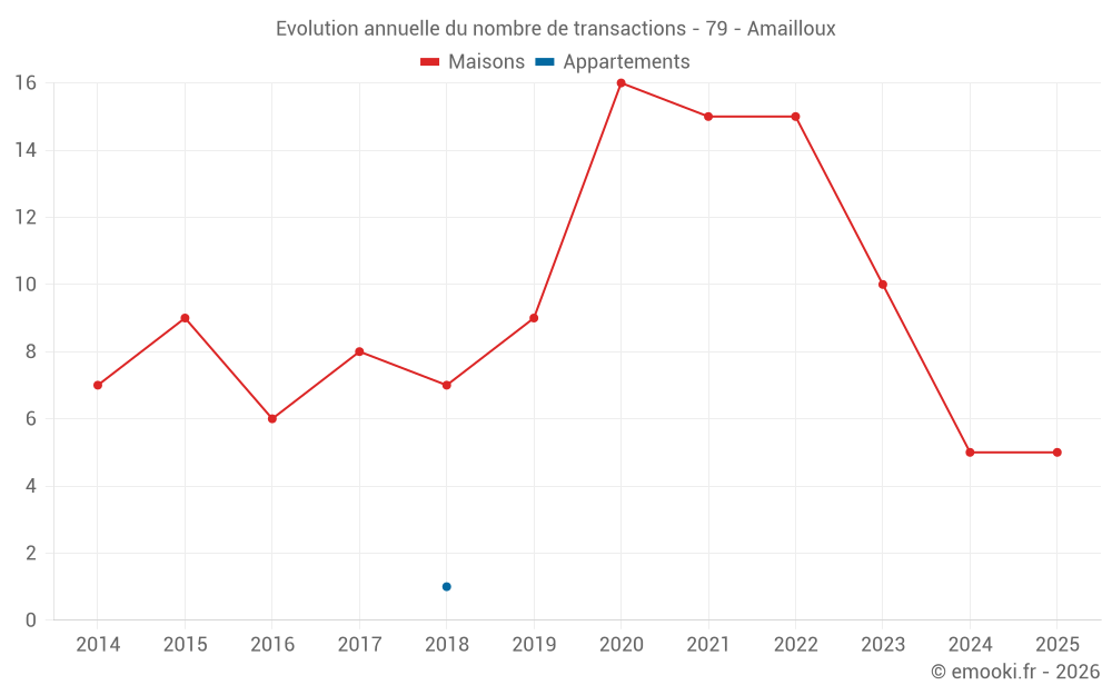 Le prix médian sur les 14 transactions de maisons des 24 derniers mois dans la commune d'Amailloux était de 1 132 € par mètre carré pour une valeur foncière médiane de 116 280 €. Sur cette période 60% des transactions se sont situées entre 571 et 1 344 € par mètre carré (du 2ème au 8ème déciles).
