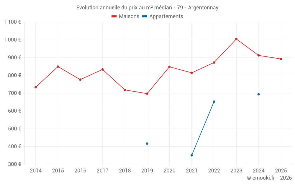 Le prix médian sur les 41 transactions de maisons des 12 derniers mois dans la commune d'Argentonnay était de 912 € par mètre carré pour une valeur foncière médiane de 98 450 €. Sur cette période 60% des transactions se sont situées entre 584 et 1 341 € par mètre carré (du 2ème au 8ème déciles).