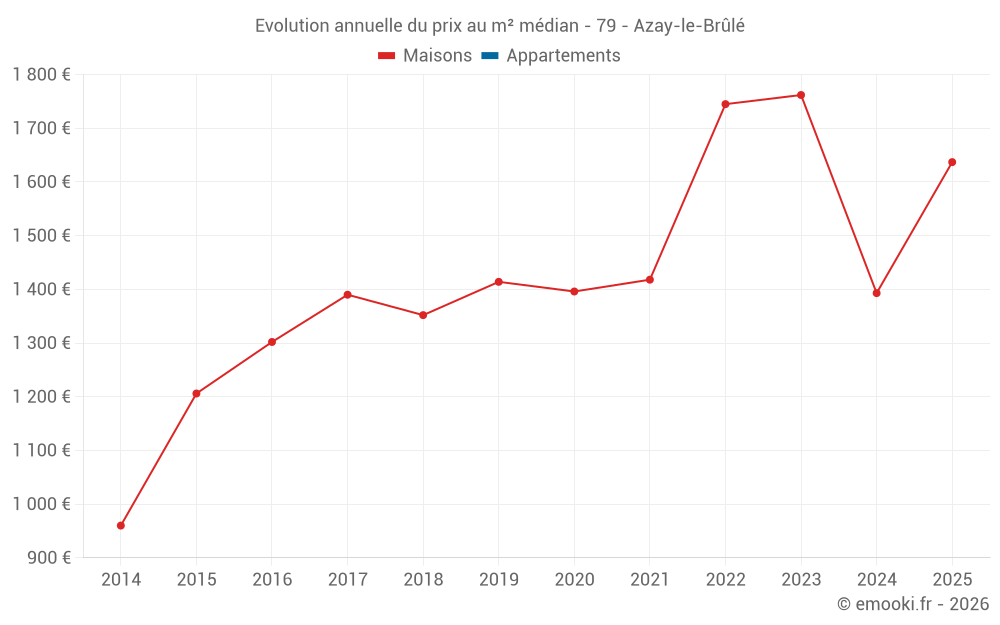 Le prix médian sur les 32 transactions de maisons des 24 derniers mois dans la commune d'Azay-le-Brûlé était de 1 540 € par mètre carré pour une valeur foncière médiane de 170 000 €. Sur cette période 60% des transactions se sont situées entre 906 et 1 988 € par mètre carré (du 2ème au 8ème déciles).